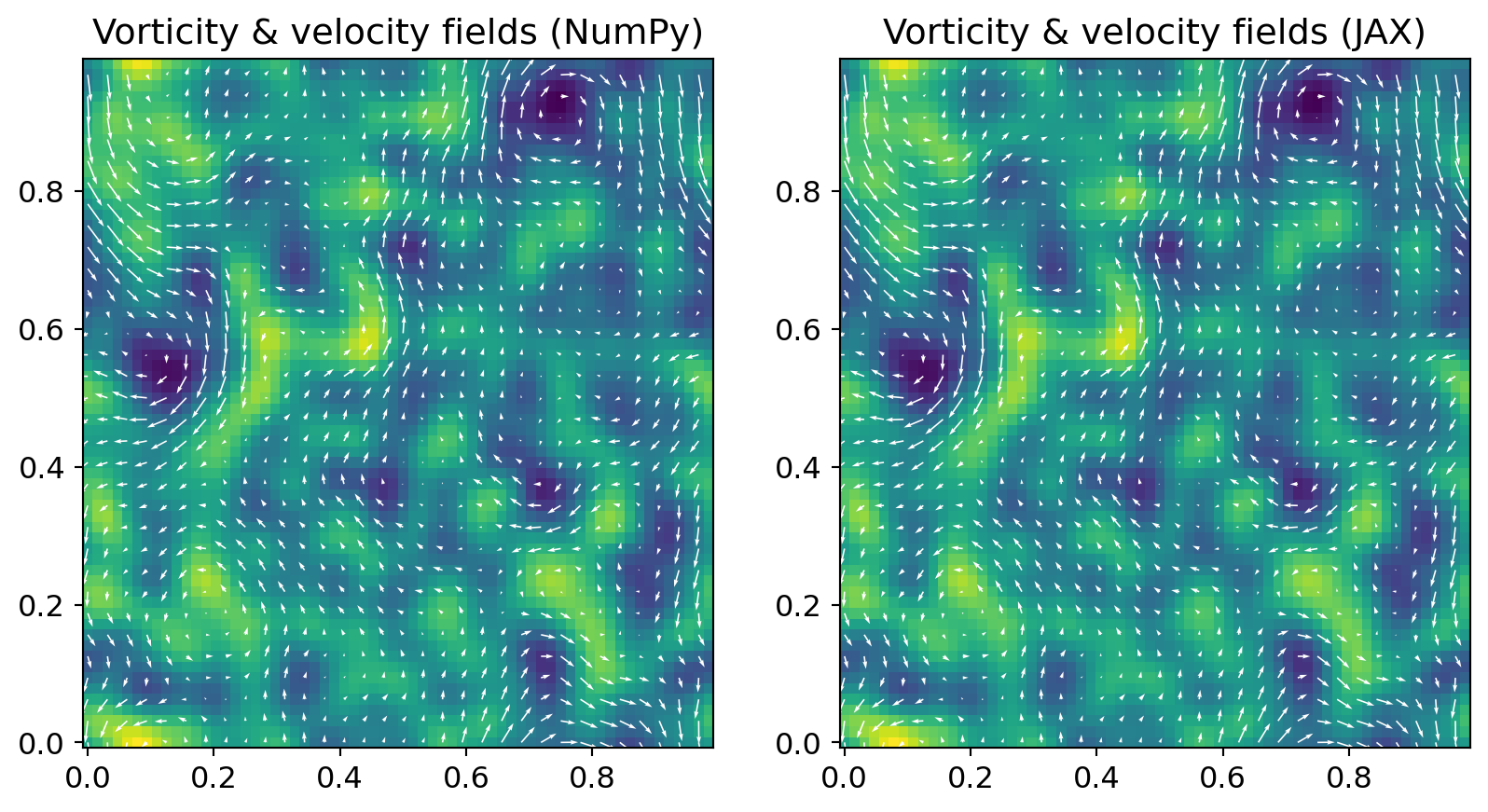 return xp.fft.irfft2(fft_vorticity, norm="ortho")We can generate initial vorticity and velocity fields with generate_vorticity and velocity_from_vorticity using either Numpy or JAX depending on array argument types:
