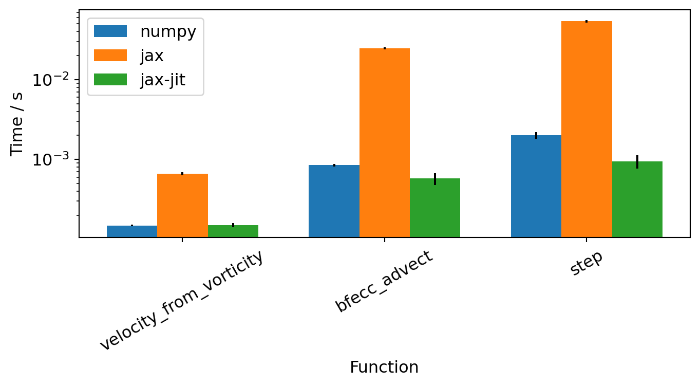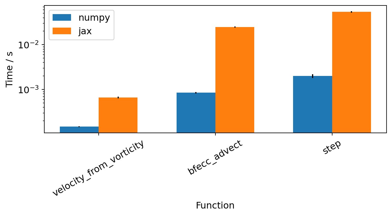 We time calling a subset of the model functions for both NumPy and JAX arrays and visualize the results: